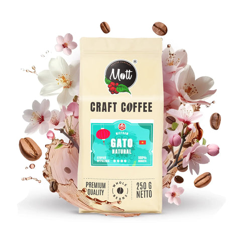 Mott Coffee Gato to ciemno palona kawa ziarnista 100% Robusta z Wietnamu, o intensywnym i gęstym smaku, z wyczuwalnymi nutami gorzkiej czekolady i orzechów, oraz większą ilością kofeiny niż Arabica.